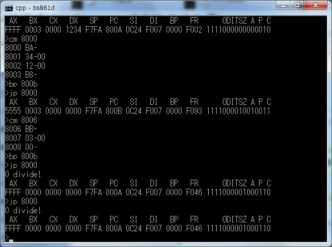 なおどちらもブレークしたように表示されていますが、上の0 DIVIDEの場合にはブレークポイントでのブレークではなくて0 DIVIDE割込みの処理プログラムの中でレジスタダンプをしたものです。