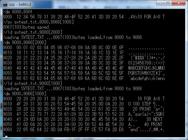 を実行して、先の/LDテストで8000〜8066[1000]にロードしたバイナリファイルをSVTEST.TXTの名前でセーブしました。