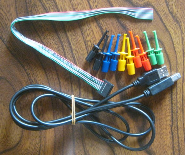 信号入力用フラットケーブルと小型テストクリップ、USBケーブルも含みます(下の写真)。