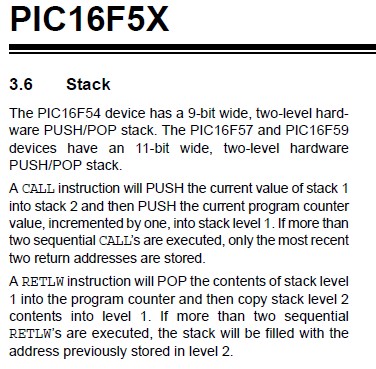なんとPIC16F57にはたった2層のスタックしかありませんでした。