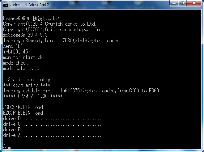 Legacy8080をWindows7(32bit)パソコンに接続して、CP/Mモードで起動したところです。