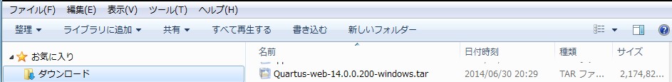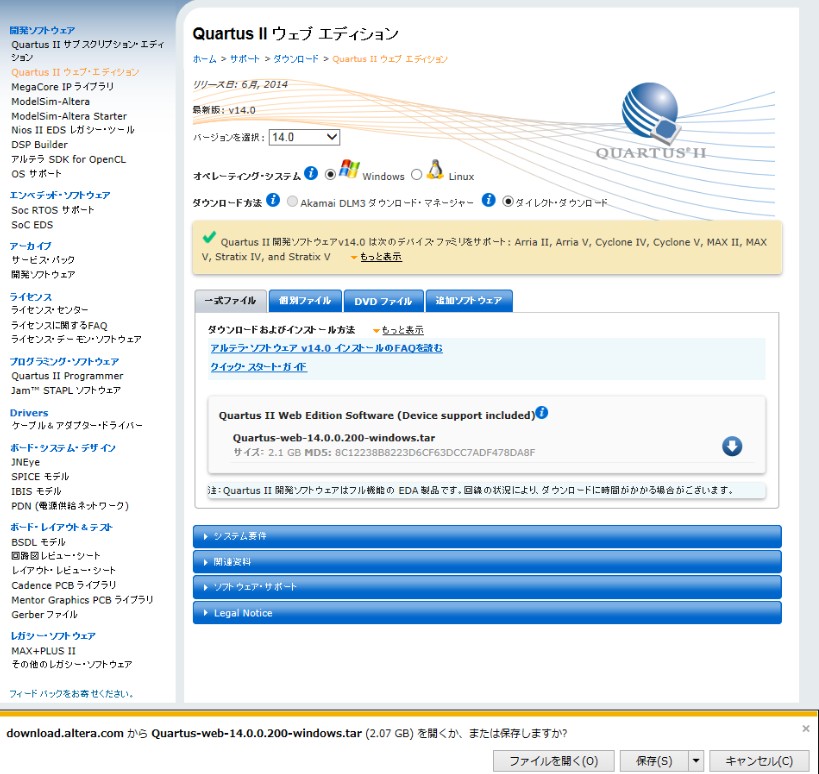 Quartus−web−14.0.0.200−windows.tarの右の矢印マーク(↓)をクリックすると、画面下部にダウンロード方法の選択表示が出ます。