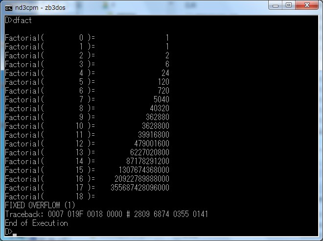 D>dir dfact.* D: DFACT PLI D>pli dfact PL/I-80 V1.0, COMPILATION OF: DFACT NO ERROR(S) IN PASS 1 NO ERROR(S) IN PASS 2 CODE SIZE = 00A5 DATA AREA = 0028 END COMPILATION D>dir dfact.* D: DFACT PLI : DFACT REL D>link dfact LINK 1.0 F 0100 /SYSIN/ 1BAD /SYSPRI/ 1BD2 ABSOLUTE 0000 CODE SIZE 1A54 (0100-1B53) DATA SIZE 01E5 (1C28-1E0C) COMMON SIZE 00D4 (1B54-1C27) USE FACTOR 5E D>dir dfact.* D: DFACT PLI : DFACT REL : DFACT COM : DFACT SYM D>dfact Factorial( 0 )= 1 Factorial( 1 )= 1 Factorial( 2 )= 2 Factorial( 3 )= 6 Factorial( 4 )= 24 Factorial( 5 )= 120 Factorial( 6 )= 720 Factorial( 7 )= 5040 Factorial( 8 )= 40320 Factorial( 9 )= 362880 Factorial( 10 )= 3628800 Factorial( 11 )= 39916800 Factorial( 12 )= 479001600 Factorial( 13 )= 6227020800 Factorial( 14 )= 87178291200 Factorial( 15 )= 1307674368000 Factorial( 16 )= 20922789888000 Factorial( 17 )= 355687428096000 Factorial( 18 )= FIXED OVERFLOW (1) Traceback: 0007 019F 0018 0000 # 2809 6874 0355 0141 End of Execution D> |