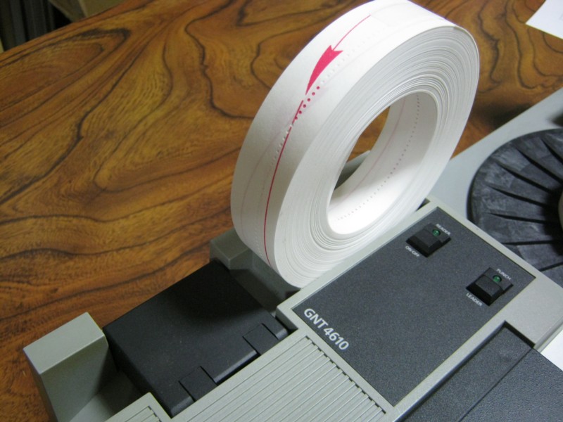 Y様の説明では紙テープの読み取りも穿孔もかなり高速なのだそうですが(高速なので注意しないと紙テープのエッジで指を切ってしまうことがあるとのことです)、そんな速さですと上からフタでもしておかないと、飛び出してしまうのではありませんかねえ。