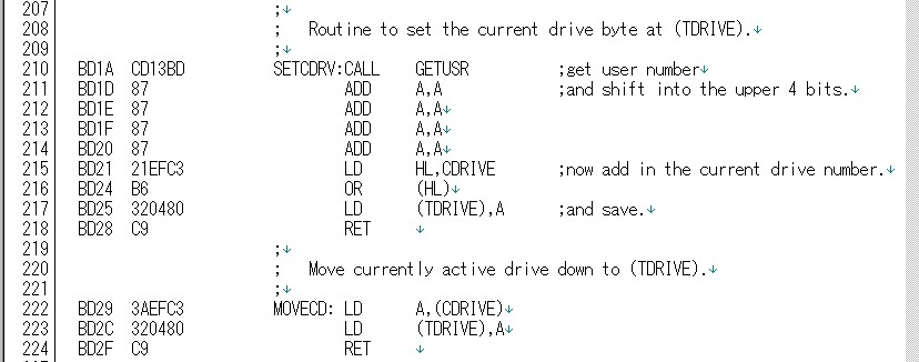 SETCDRV(set current driveの略だと思われます)では、1バイトの記憶場所CDRIVE(アドレスC3EFH)の値の上位4ビットをユーザーコードにした上でTDRIVE(アドレス8004H。本来は0004H)に入れています。