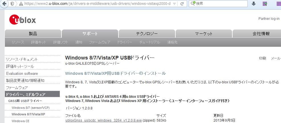 ドライバはUbloxのサイトにありました(下のリンク)。