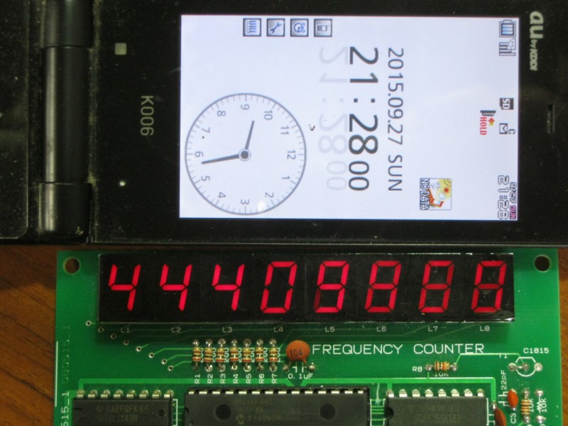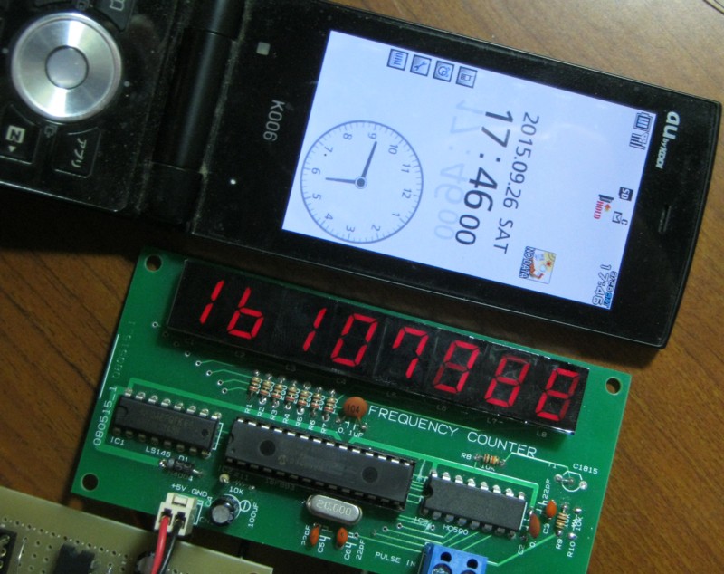 そこで試作品周波数カウンタに細工をして、入力パルスを1秒間の連続測定しているところを、プッシュスイッチを押したら測定をスタートして、もう一度押したら終了するというように、ハードとソフトの両方を直しました。