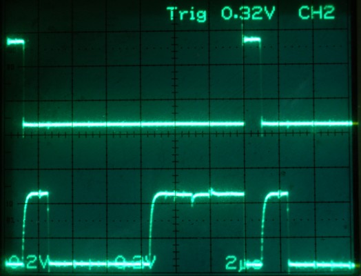 上(CH1)は、74HC126の入力信号(M2をインバートしたもの)で、下(CH2)はd1の波形です。