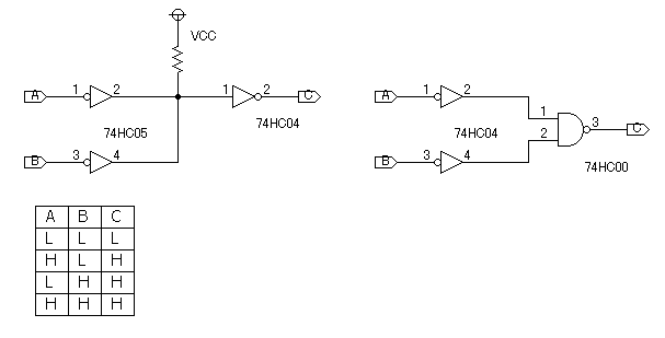 今度はさきほどとは逆で、A、B、Cは負論理ですけれど、間にインバータが入っていますから、74HC05の出力が結合したラインを見ると、そこは正論理(Hアクティブ)になっています。右図を見れば、このラインがANDであることは間違いありません。