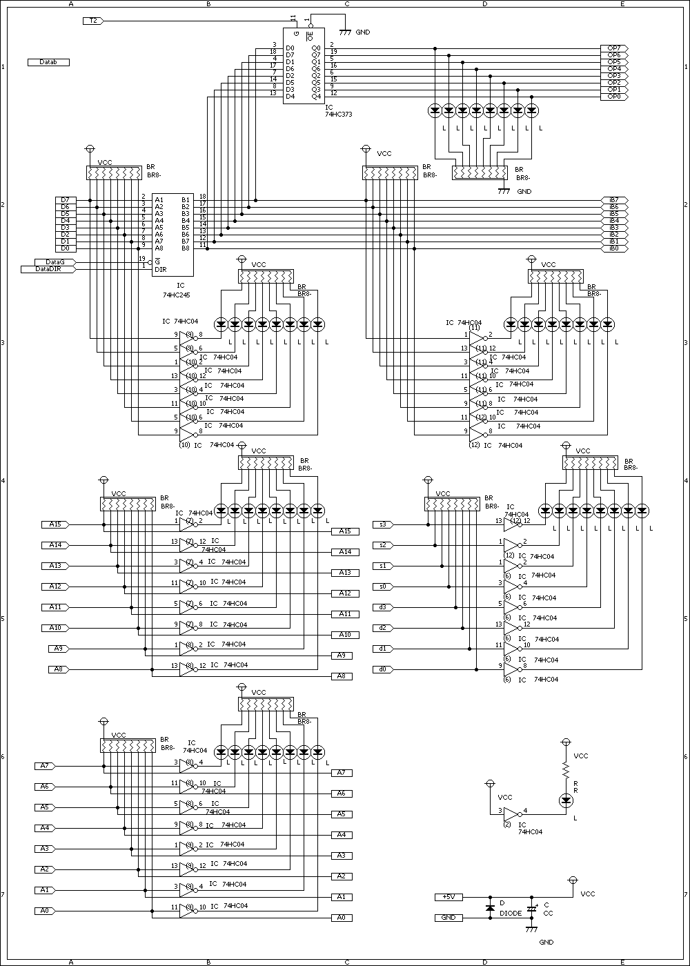 レジスタのデータ出力ラインについているLED回路と、アドレスバス、データバスなどの74HC04からの出力ラインについているLED回路とでは信号に対するLEDの向きが反対になっています。