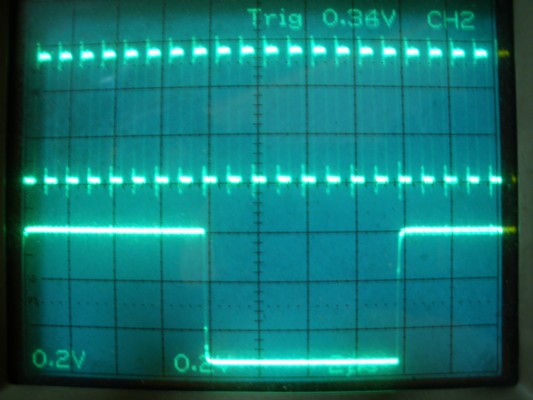 まだ命令回路がありませんからA〜Eクロックが一巡するごとに(16μs)、1パルスが出ています。