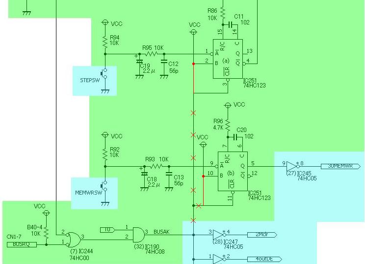 IC251(74HC123)のCLR端子(pin3、pin11)はVccにプルアップしなければいけなかったのに、間違った回路のままになっていました。