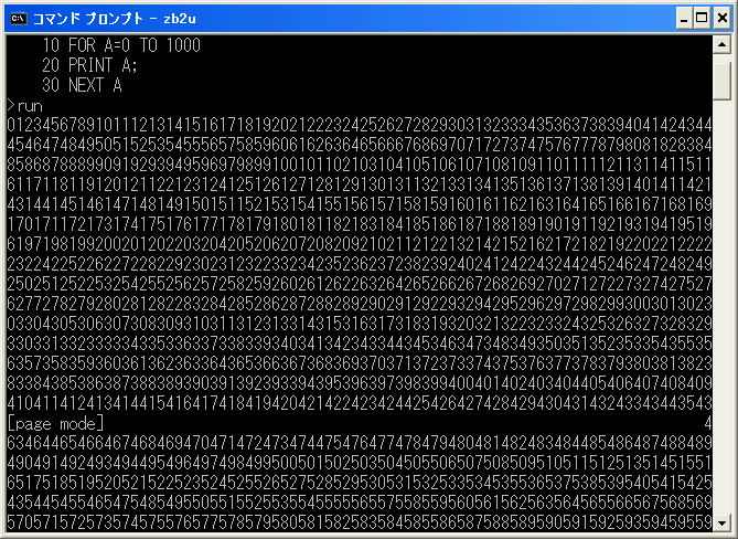 スクロールバーを使った画面表示と違って、Z80BASICのpagemode画面では、表示されている画面のどこへでも[←][↑][↓][→]キーでカーソルを移動して、そこで表示されている文字の書き換え、再入力などを自由に行うことができます。