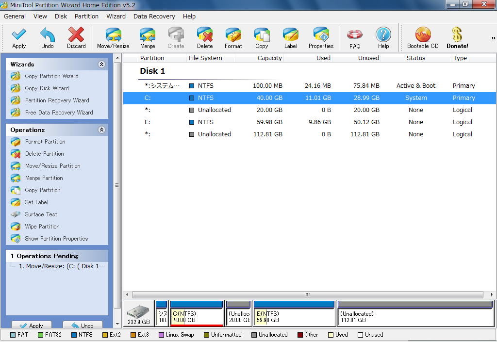 実はそのあとで、Cドライブに80GBは大きすぎるなあ、という感じがしましたので、またまたMiniTool Partition Wizardを使って、Cドライブを80GBから60GBに縮めてしまいました。