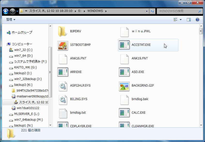 こちらはそのWindows98が起動しなくなったハードディスクを直接Windows7パソコンに接続してWindowsフォルダを開いてみたところです。