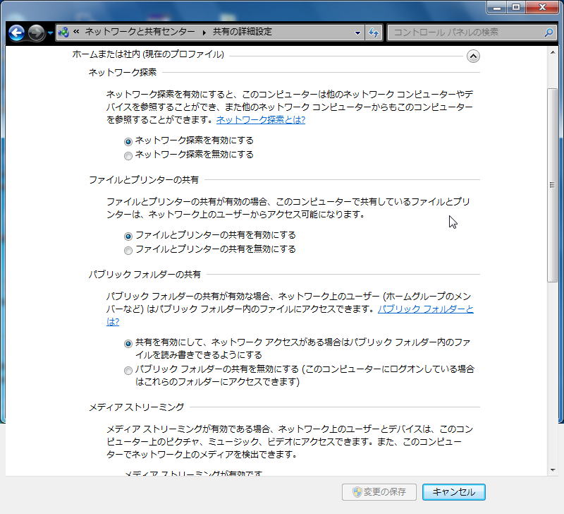 あ。前にも書いたことですけれど、「ネットワークと共有センター」で「共有の詳細設定の変更」をクリックして、下のようになっていることを確認しておきます。
