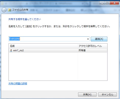 Windows7で、Usersフォルダ以外のフォルダを共有しようとする場合の設定の仕方です。