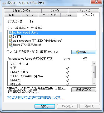 「詳細な共有」をクリックすると、ボリューム(E:)のプロパティがひらきます。