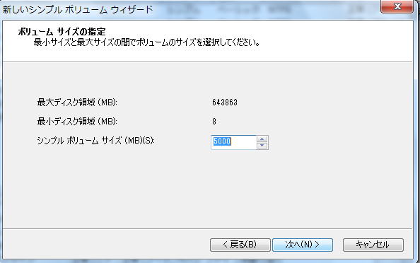 ボリュームサイズのところに5000(5GB)と入力して「次へ」をクリックします。