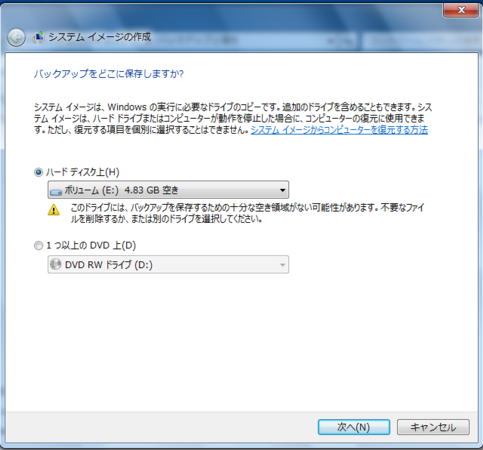 それでは、このボリューム(E:)にシステムイメージを作成してみましょう。