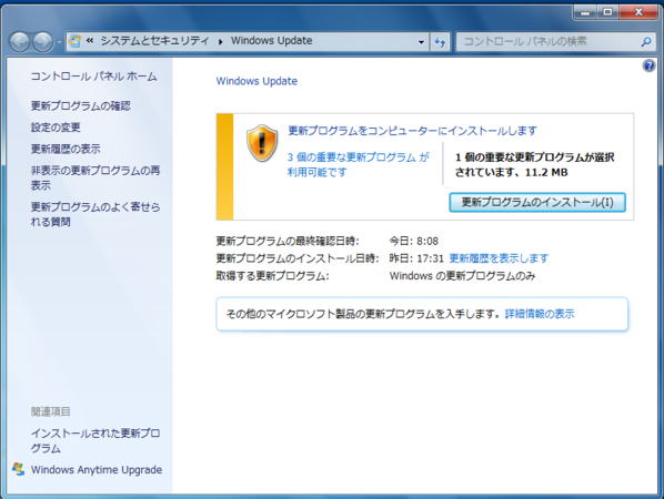 ここで「3個の重要な更新プログラムが利用可能です」をクリックしましたら、このページのトップにお見せした画面になりました。