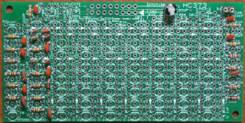 このあとトランジスタも実装するのですが、今回は動作テストの関係でCS_&RD_回路、ビット7回路もまとめて実装しますので、先にトランジスタ以外のパーツを実装することにします。
