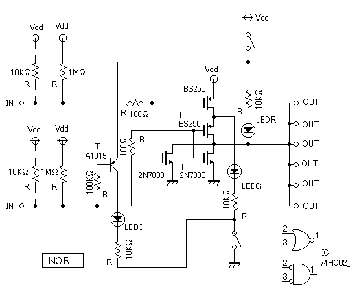 2入力NORですから2つの入力がともにL(緑LED点灯)のときのみ出力がH(赤LED消灯)になります。