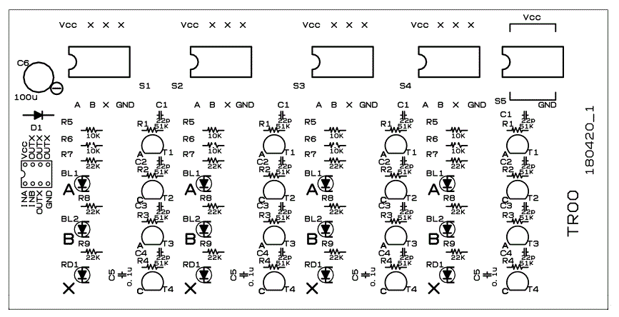 以前の組立キット「HC00」と同様に74HC00相当のロジック回路(2inputNANDgate)ですが、HighspeedCMOSではなくてバイポーラトランジスタ(2SA1015、2SC1815)によるコンプリメンタリ(相補型)回路ですから、それを以前と同じ「HC」と称するのは「羊頭狗肉」かと考えた末に「TR00」と称することにしました。