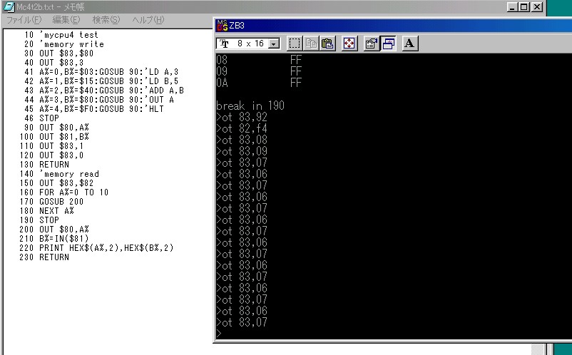 ●動作テスト(5)LD A,d、LD B,d、ADD A,B、OUT A、HLT(前回の続き)