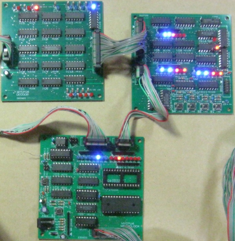 写真右上のREGISTER基板のd3〜d0(内部バス、青色LED)にAレジスタの値(0011)が出力されそのようにLEDが点灯しています。