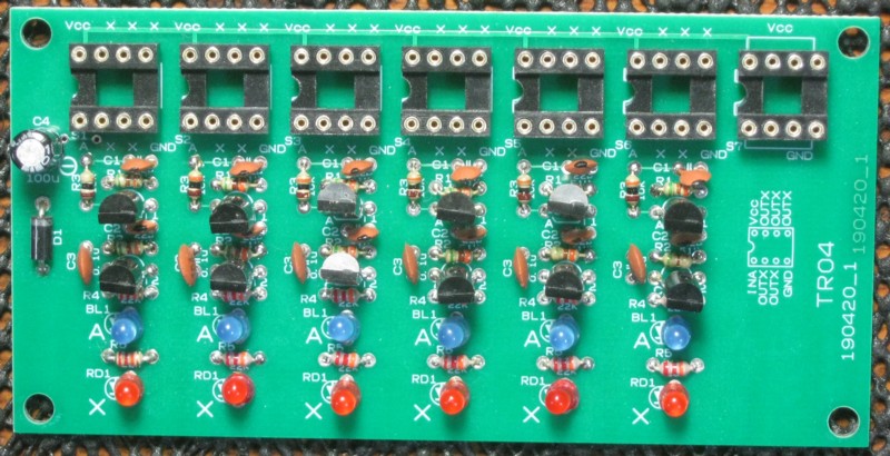 組立キットTR04は74LS04と同様1枚の基板に6ゲート分の回路が載っています。