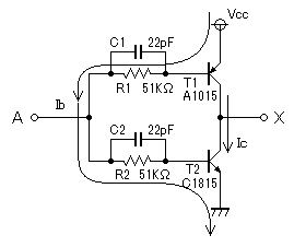 入力がHのときは2SC1815がONになり、逆に入力がLのときには2SA1015がONになります。