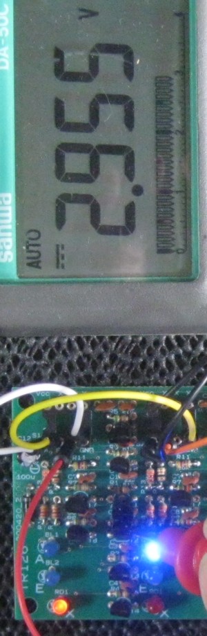 念のため出力XをGNDにショートしないで、赤色LEDがわずかに点灯している状態でT2のコレクタの電圧を測ってみました。