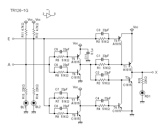 今回の回路ではE入力回路のロジックを逆にしたためE入力につながる2SC1815が1個になりました。
