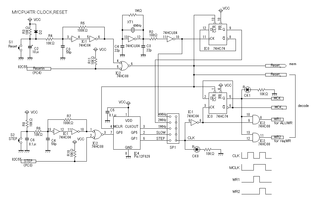 ところでMYCPUTRの命令動作はMCLKの立ち下がりから次の立ち下がりまでの2CPUクロックで完了します。