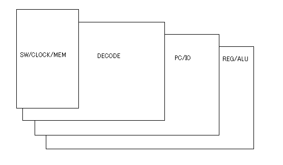 スイッチ/CLOCK/MEM基板を合わせてつごう4枚の基板を図のように重ねて配置して適当な寸法のスペーサで固定します。