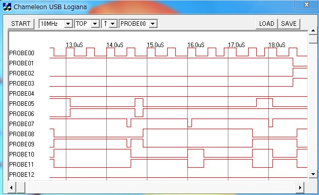 MC4T11B.TXTを実行して得られるテストプログラムをCPUクロック4MHzで実行して、それをいつものカメレオンロジアナで観測しました。