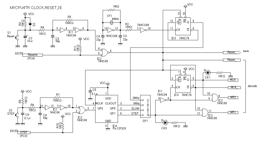 SW/CLOCK/MEM回路は当初はHCMOSIC版MYCPU4の回路基板をそのまま使うつもりでしたのでMYCPU4TRのものとしては回路図はお見せしていませんでした。