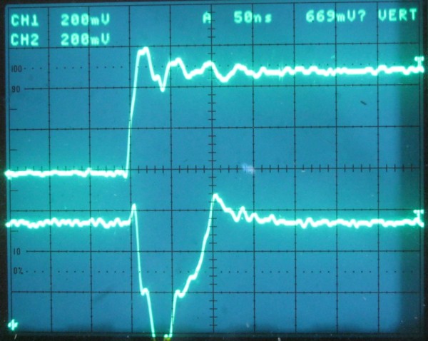 さきほどのオシロの写真とはタイミングの関係で画像の左側部分の波形と右側の波形が逆位置になっていますがCH1とCH2の波形の関係は同じです。