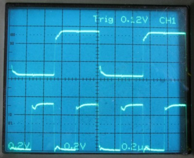 下の写真は下側(CH2)に上の回路の出力信号が出ています。