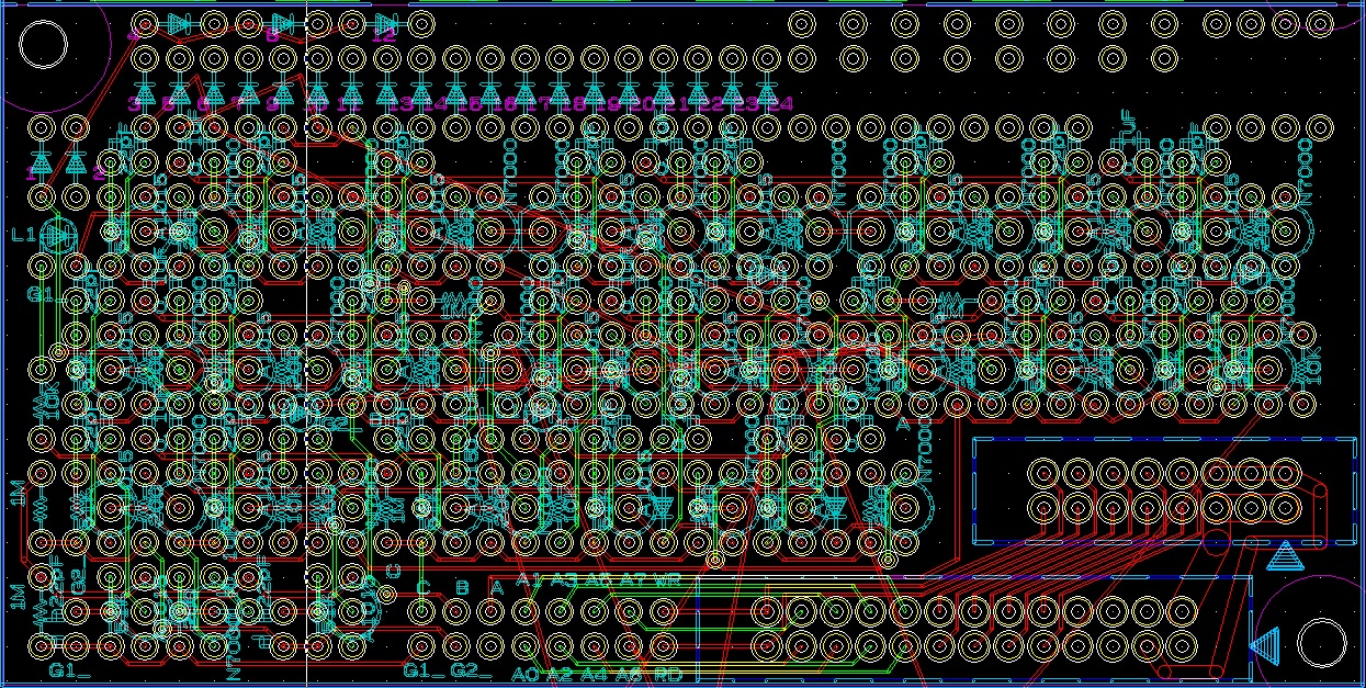 下はコネクタ以外のスルー穴径を0.7φ(ランド径は1.2φ)に置き換えて、その間に2本のラインを通して配線作業を完了したアートワーク図です。