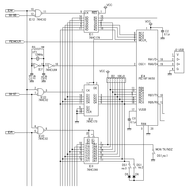 今回の作業ではFT245BLを使ったUSBインターフェース回路を上図のPIC18F14K50を使った回路に置き換えたいと考えたのですが、上図の回路と同じ回路に置き換えるわけにはいきません。
