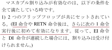 はっきり確かめることをしないでEI RETIの次の命令の実行後に割込みが受け付けられると思い込んでしまっていました。