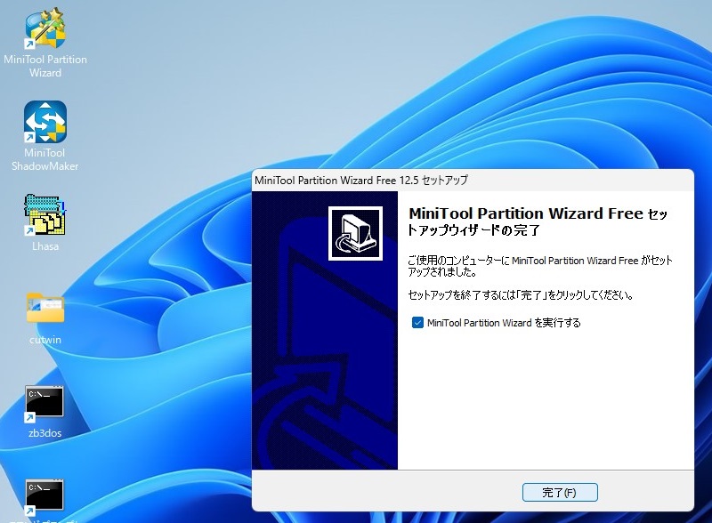 「Minitool Partition Wizardを実行する」にチェックが入ったまま「完了」をクリックしました。