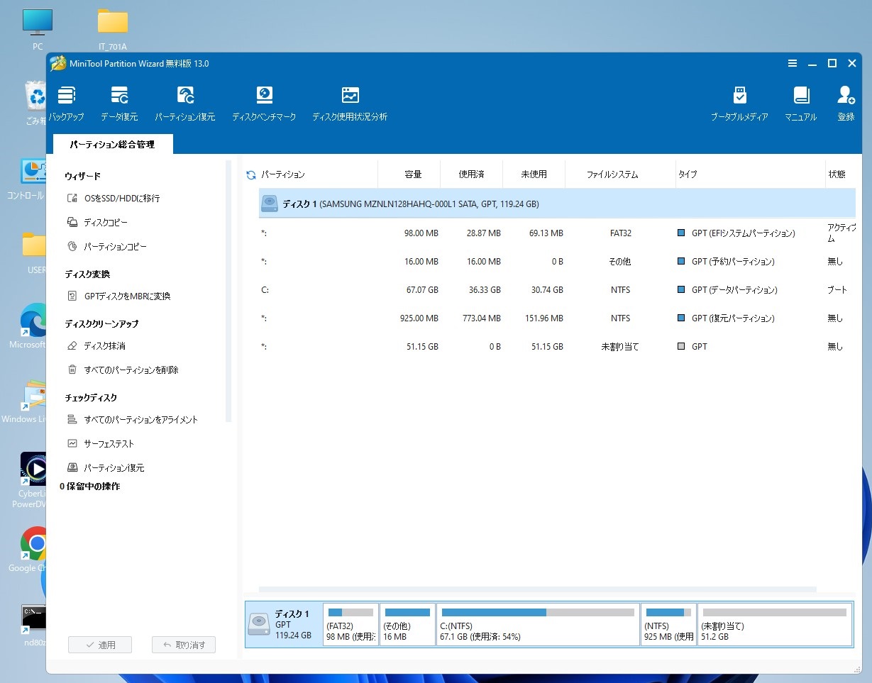 前回は記憶は定かではないのですが、というより全く記憶が無いのですが今年の何時かにダウンロードしたはずのMinitool Partition Wizard V12.9を実行してみたところネットの情報通りクローンディスクの作成は有料版でなければできないことが判明しました。