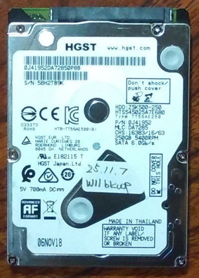 テストが終ったので取り外したクローンディスク(HDD)です。