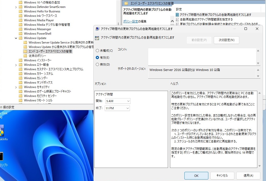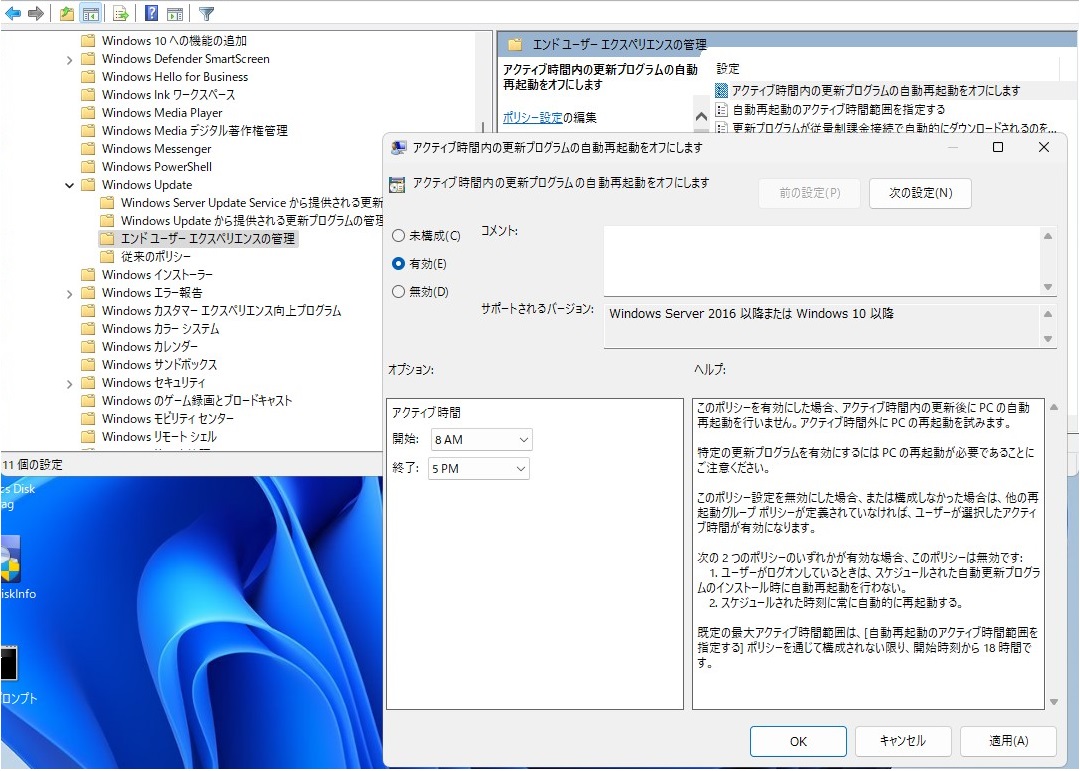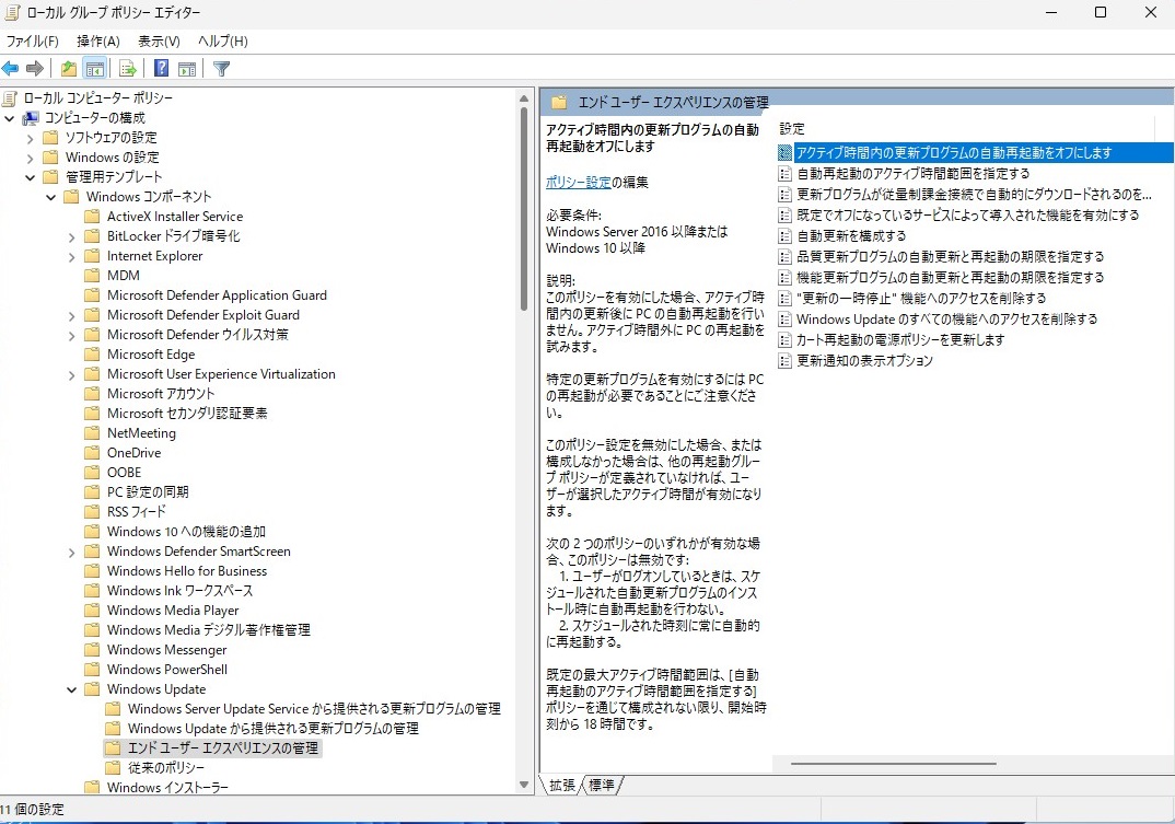 「コンピューターの構成」→「管理用テンプレート」→「Windowsコンポーネント」→「Windows Update」→「エンドユーザーエクスペリエンスの管理」と進み「アクティブ時間内の更新プログラムの自動再起動をオフにします」を右クリックして「編集」を選択します。