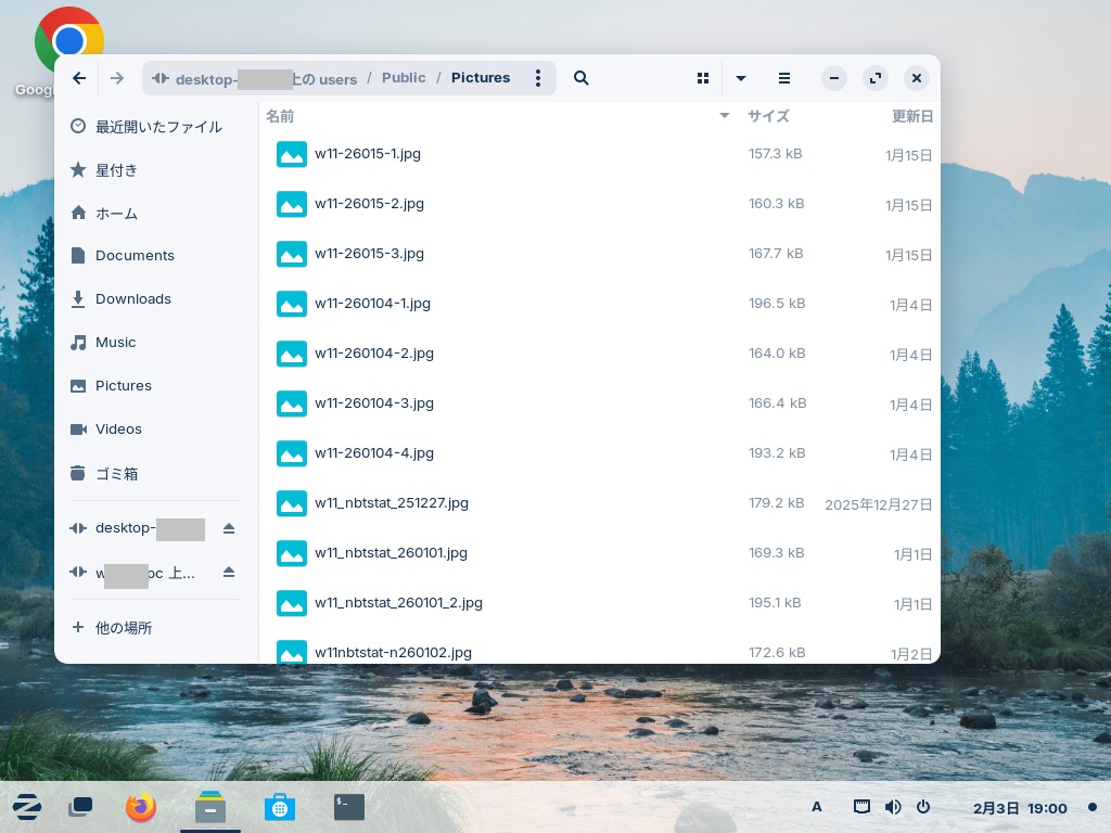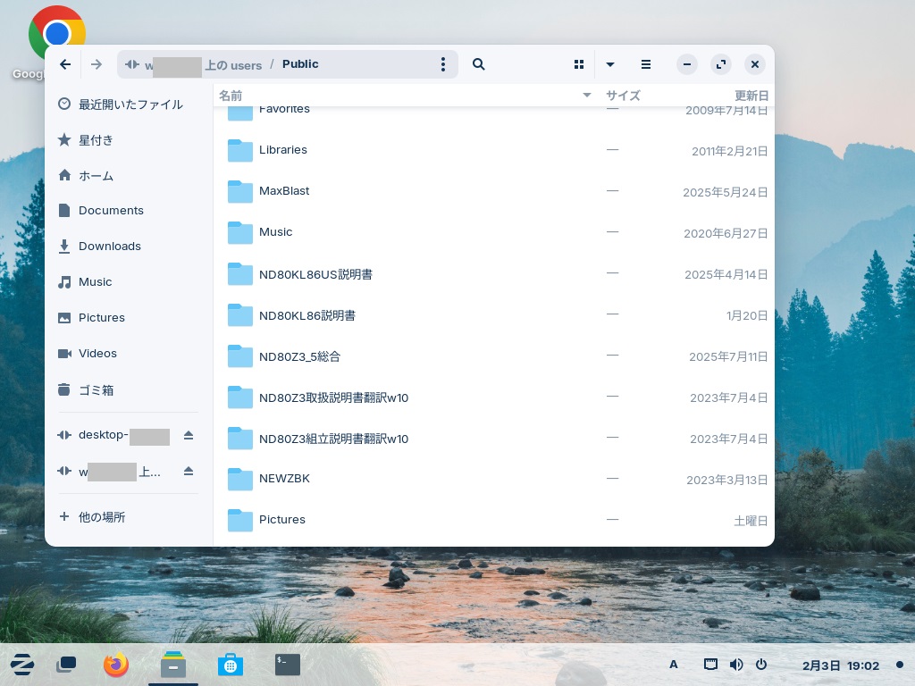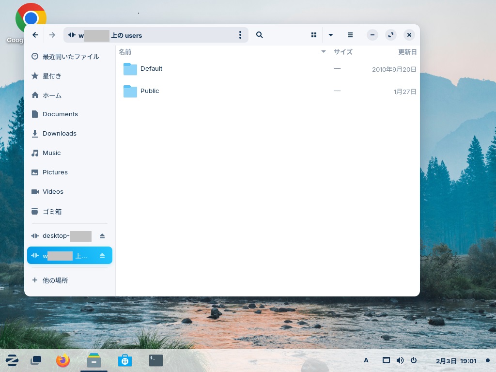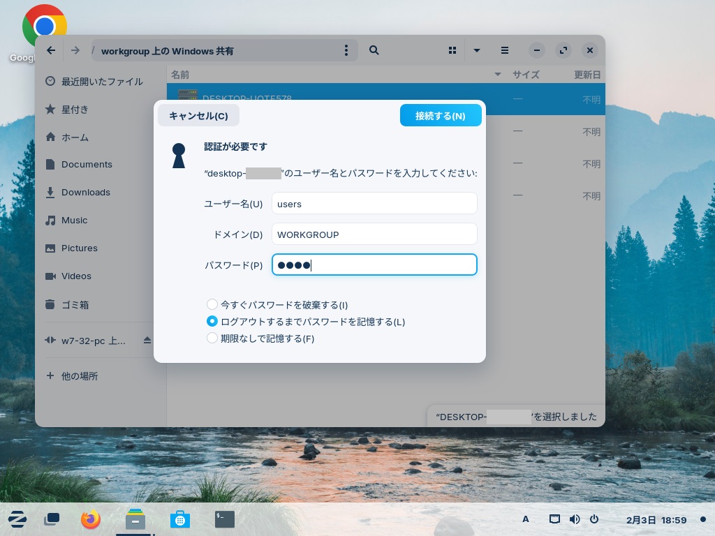 ここまで見るとZORIN OSのネットワーク表示はWindowsマシンと同じように見えますがZORIN OSの場合Windowsマシンの共有フォルダを開くためには手続きが必要になります。