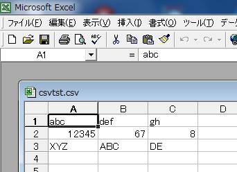 EXCELでCSVTST.TXTを開いてみます。