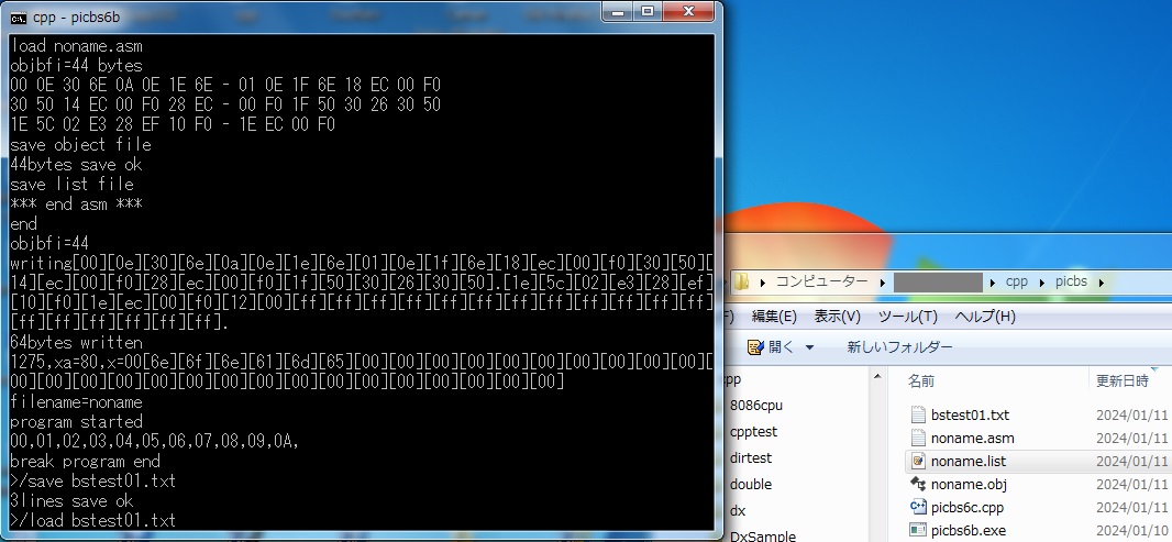 /LOADコマンドを実行すると指定したBASICプログラムがロードされたあと、コンパイラとアセンブラが実行されてLISTファイルとASMファイルとOBJファイルが作成されます。